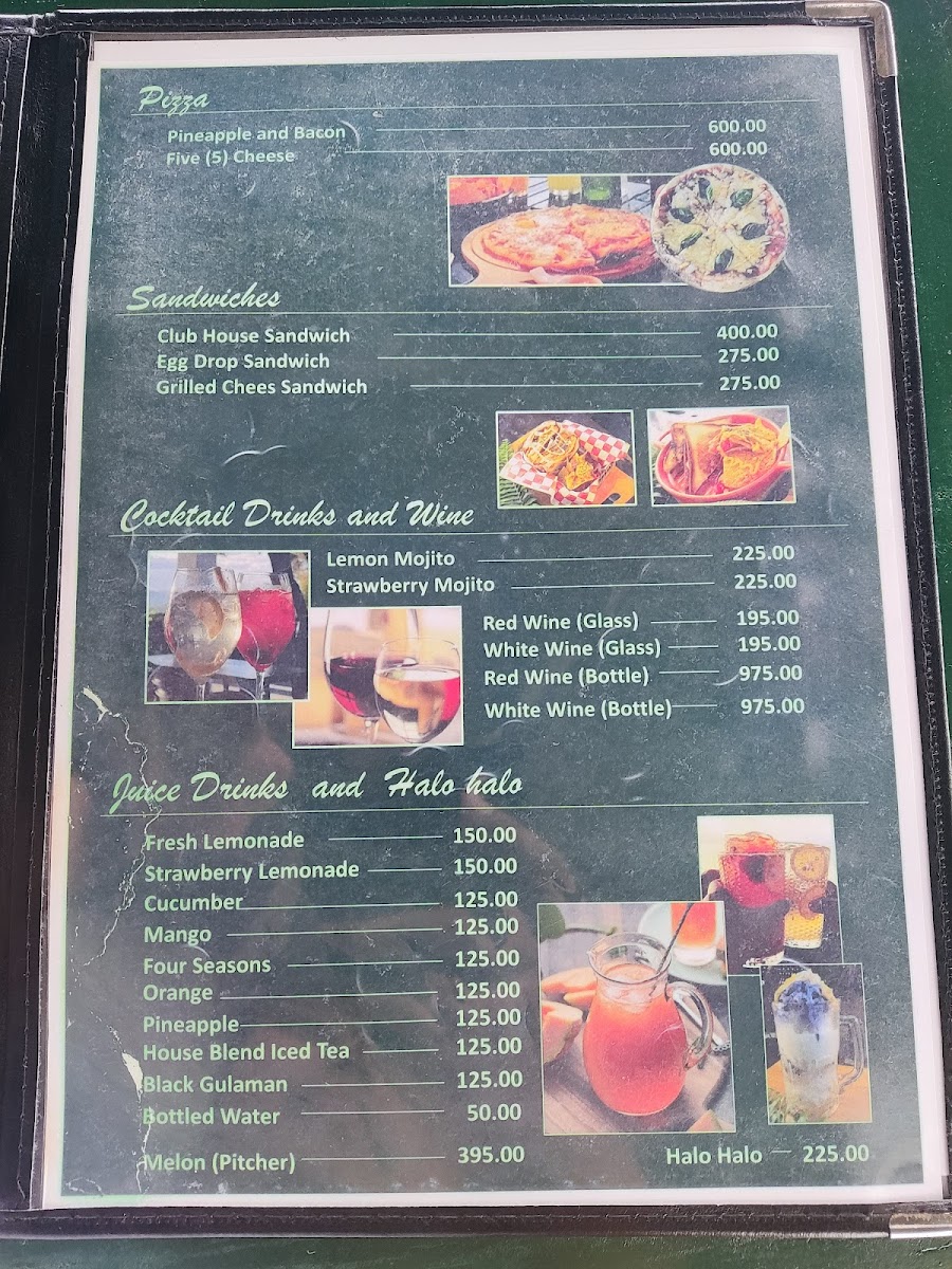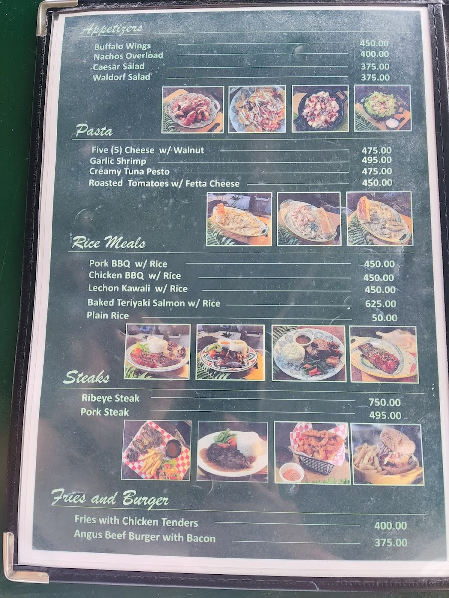 Food selections include grilled and roasted items like pork steak and chicken barbecue, pasta dishes such as creamy tuna pesto pasta and roasted garlic tomatoes with feta cheese pasta, as well as sandwiches and burgers like the clubhouse sandwich and angus burger. There are also familiar Filipino breakfast options like tapsilog and popular side dishes including french fries paired with chicken tenders.
